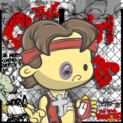 The GRAFFPUNKS’ purpose is to reclaim the digital landscape from its monolithic order. They view the pristine, organized networks of the new world as sterile and lifeless. To them, true art is found in chaos and disruption. They do not fight with weapons like the HODL Warriors or seek to win games like the AllCity Bulls. Instead, they wield “Glitch-bombs” and “Data-paint,” corrupting clean code with vibrant, chaotic “tags.” These tags are not just random noise; they are digital masterpieces, each one a unique fusion of vibrant colors and glitch art that tells a story of resistance.